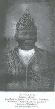 Chief Adebesin Folarin (also known as Josiah Folarin Williams, Josiah Fitzac Folarin and Debeshin Folarin) (1877 – 4 October 1949) was a Nigerian barrister, judge, public official, historian and author. He was one of the leading intellectuals in early 20th-century Abeokuta, and is recognised as "one of the first truly nationalist historians".[20] In 1914, he was offered and accepted the post of Legal Adviser and Law Officer in the Egba United Government.