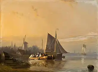 While still enrolled at the academy, Linnig participated in the Triennial Salon of Antwerp in 1840 exhibiting two marine paintings, Fishing for Herring on the Dogger Bank and Coast near Zierikzee.[2] In 1842 Linnig decided to put an end to his academic studies. In the summer of the following year he joined the crew of fishing boats in order to study all ship maneuvers in detail. Linnig would in later years continue to take small sea trips for inspiration. One of the trips inspired him to the painting The brig 'Timor' shipwrecked off the English coast, which he exhibited at the Triennial Salon in Brussels in 1842.[1]
