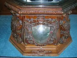 The glass case that covers the trophy has wooded framed sections and rises up from an ornately carved eight-sided wooden base emblazoned with four coats of arms, earls coronets, and with a silver engraved dedicatory shield. This base stands around 2 feet and 10 inches (85 cm) in height.[1] The dedicatory shield reads "Presented to Archibald, Earl of Eglinton, by the Visitors to the Eglinton Tournament held at Eglinton Castle. MDCCCXXXIX."