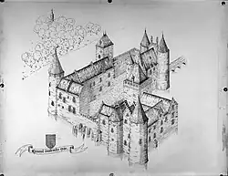 The third castle was constructed in two phases.[7] It was built on what is supposed to have been the outer bailey of the old circular castle. It also replaced this castle. The former outer bailey was divided into a western and eastern side. The first phase saw the construction of a new small square main castle on the eastern half of the former outer bailey. It had a large tower house, often designated as donjon.