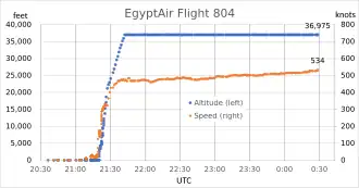 The aircraft departed for Cairo International Airport from Charles de Gaulle Airport on 18 May 2016 at 23:09 (all times refer to UTC+2, used in France and Egypt at the time).[16][17] It disappeared from radar while flying at flight level 370 (about 37,000 ft (11,300 m) in altitude) in clear weather, 280 km (170 mi; 150 nmi) north of the Egyptian coast,[18] and about the same distance from Kastellorizo, over the eastern Mediterranean on 19 May at 02:30.[19][20][21] The aircraft crashed into the sea at around 02:33, when the last ACARS message was sent. The flight had lasted 3 hours 25 minutes.[22]