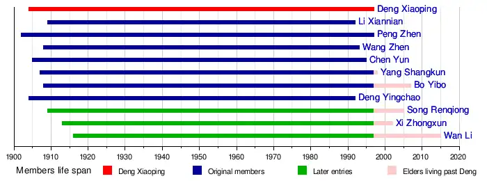 The membership was never formally stated. With Deng Xiaoping as the main holder of power, the eight elders are accepted to include:[6]