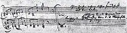 Kleine Gigue in G major, K. 574, is a composition for solo piano by Wolfgang Amadeus Mozart during his stay in Leipzig. It is dated 16 May 1789, the day before he left Leipzig. It was directly written into the notebook of Leipzig court organist Carl Immanuel Engel. It is often cited as a tribute by Mozart to J. S. Bach, although many scholars have likened it to Handel's Gigue from the Suite No. 8 in F minor, HWV 433.[1] In fact, the subject of the gigue bears a marked similarity to the subject of J. S. Bach's B minor fugue no. 24 from book 1 of The Well-Tempered Clavier. Mozart has changed the tempo from Largo to Allegro deciso and the time signature from common time to 6