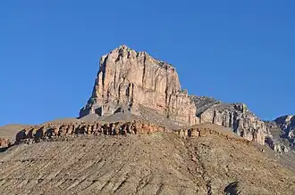 El Capitan (Spanish: El Capitán) is a peak in Culberson County, Texas, located within Guadalupe Mountains National Park.[2] The 7th-highest peak in Texas at 8,085 ft (2,464 m), El Capitan is part of the Guadalupe Mountains, an exposed portion of a Permian period reef uplifted and exposed by tectonic activity during the late Cretaceous period.[3] The southern terminus of the Guadalupe Mountains, El Capitan looms over U.S. 62/180, where its imposing height and stark outline have made it one of the iconic images of the Trans-Pecos to generations of travelers.