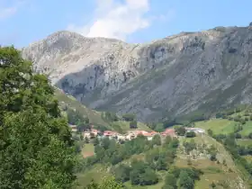 The village sits at the western end of a 2.5 km closed valley drained by the Río Belugas and the Río del Pasador, which join just before sinking into Cueva del Bolugo[3] (43°22′45″N 4°51′03″W / 43.37917°N 4.85083°W); the river passes nearly directly under the village to resurge at Caldueñin (43°22′48″N 4°51′54″W / 43.38000°N 4.86500°W).