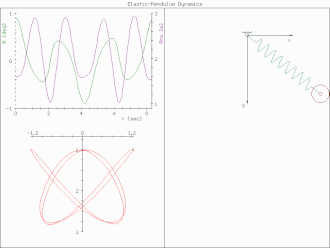 In physics and mathematics, in the area of dynamical systems, an elastic pendulum[1][2] (also called spring pendulum[3][4] or swinging spring) is a physical system where a piece of mass is connected to a spring so that the resulting motion contains elements of both a simple pendulum and a one-dimensional spring-mass system.[2] For specific energy values, the system demonstrates all the hallmarks of chaotic behavior and is sensitive to initial conditions.[2] At very low and very high energy, there also appears to be regular motion. [5] The motion of an elastic pendulum is governed by a set of coupled ordinary differential equations. This behavior suggests a complex interplay between energy states and system dynamics.