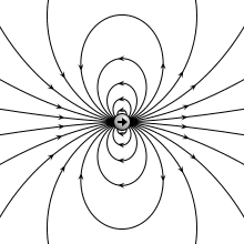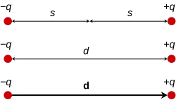 1. ^ Many theorists predict elementary particles can have very tiny electric dipole moments, possibly without separated charge. Such small dipoles make no difference to everyday physics, and have not yet been observed (see Electron electric dipole moment). However, when making measurements at a distance much larger than the charge separation, the dipole gives a good approximation of the actual electric field. The dipole is represented by a vector from the negative charge towards the positive charge.