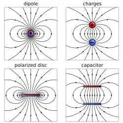 The electric field due to a point dipole (upper left), a physical dipole of electric charges (upper right), a thin polarized sheet (lower left) or a plate capacitor (lower right). All generate the same field profile when the arrangement is infinitesimally small.