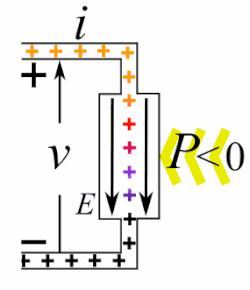 - Active devices (power sources): if conventional electric current (positive charge) is forced to flow through the device in the direction from the lower electric potential to the higher, against the opposing force of the electric field (E) between the terminals (this is equivalent to the negatively charged electrons moving from the positive terminal to the negative terminal) work will be done on the charges. So energy is being converted to electric potential energy from some other type of energy, such as mechanical energy or chemical energy. Devices in which this occurs are called active devices or power sources; such as electric generators and batteries.