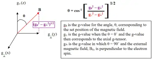 The traditional convention of magnetic resonance envisions the paramagnets aligning with the external magnetic field; however, in practice it is simpler to treat the paramagnets as fixed and the external magnetic field as a vector. Specifying positional relationships requires three separate but related pieces of information: an origin, the distance from said origin, and a direction of that distance.[13] The origin, for purposes of this explanation, can be thought of as the position of a molecule's localized unpaired electron. To determine the direction to the spin active nucleus from the localized unpaired electron (remember: unpaired electrons are, themselves, spin active) one employs the principle of magnetic angle selection. The exact value of θ is calculated as follows to the right:
