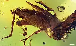 Electrotettix is an extinct genus of pygmy locust found in amber collected in the Dominican Republic. Represented by a single species, Electrotettix attenboroughi, which lived 18-20 million years ago, it fed primarily on moss, fungi, and algae.[2] The genus name is derived from electrum, Latin for "amber", and Greek tettix, meaning "grasshopper".[2] The species was named after Sir David Attenborough.[3] The female measures 8 millimeters in length: the male is unknown. The species is distinguished from modern members of the Cladonotinae subfamily by the fact that it retains vestigial wings, a feature lost somewhere between the ancient specimens and more modern species.[1][2] E. attenboroughi was identified from a collection of amber at the Illinois Natural History Survey, which had been stored in a cabinet under a sink since it was collected in the 1950s by entomologist Milton Sanderson.[4]