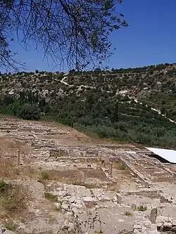 The city is situated in a strategic geographical position: it is safeguarded by mountains to the south but retains access to the sea in the north and it controls important roads located north and east of the city.[9] The acropolis can be accessed via a narrow route overlooked by a tower, the Greek word for which ("πύργος,"pýrgos") lends its name to the nearby hill: Pyrgi. This hill is itself flanked by two torrent-beds, of which the western side is called Haplota and the eastern is called Farangitis. Excavations of the natural terrace on the hill, the central plateau, revealed hundreds of small obsidian pieces—comprising materials such as flakes, cores, and blades—dating to the Early Minoan period alongside pottery from the Early Minoan to the Late Minoan IIIc period. The Early Minoan pottery samples included wares imported from Vasiliki, Pyrgos, and Agios Onoufrios.[10]