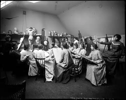 When she had left the girls' school in Örebro Elin Wallin went to evening courses at the Technical school in Örebro in 1901 and 1902. In 1902 she passed the examination as a needlework mistress at Hulda Lundin's seminary in Stockholm and after that she continued her studies in 1902–1904 at Althins målarskola. Caleb Althin was the founder of Althin's school of painting, a private art school on Grevgatan 26 in Östermalm in Stockholm. For several decades the school played an important role in preparing young artists for the Academy of Arts. During the years 1902–1904 Wallin studied in the evenings at the University College of Arts, Crafts and Design (in Swedish simply known as Konstfack) in Stockholm. Konstfack, sometimes also called Tekniska skolan, was at that time in the block of Beridarebanan in Norrmalm, between Klara kyrka and Hötorget. During two periods, in 1905–1906 and 1910–1911, she studied at the Académie Colarossi in Paris. The Académie Colarossi accepted female students and allowed them to draw from the nude male model. Colarossi was as an alternative to the government-sanctioned École des Beaux Arts that had, in the eyes of many promising young artists at the time, become far too conservative. Together with her husband David Wallin she travelled for study to London in 1905, Paris 1905–1906 and 1910–1911, Italy 1908–1910, Germany 1905, 1906 and 1908, Denmark 1908.