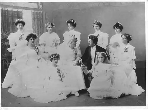 Elin Wallin was only 20 years old when she married David Wallin, 29 years old, on 14 September 1905; they had been engaged since 25 March that year. It was a solemn church wedding and the ceremony took place in Sankt Nikolai church in Örebro,[3][4] Elin's home town. Dinner was given at Stora hotellet, Örebro, the town's oldest hotel nearby Storbron and Örebro slott at the corner of Drottninggatan 1 and Engelbrektsgatan.[5][6] The priest who married them, the dean Erik Edlund, was Elin's confirmation priest. The newly married husband David had an exhibition in Örebro in the same week as the wedding. It was one of the first exhibitions that David ever had.