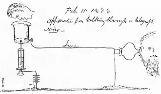 Bell returned to Boston and resumed work on March 9, drawing a diagram in his lab notebook of a water transmitter being used face down, very similar to that shown in Gray's caveat.[21] Bell and Watson built and tested a liquid transmitter design on March 10 and successfully transmitted clear speech saying "Mr. Watson – come here – I want to see you." Bell's notebooks became public when they were donated to the Library of Congress in 1976.[22]