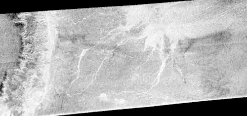 Elivagar Flumina is a network of river channels, known as flumina, located in the region around the Menrva Crater of Titan. These channels range in length from 23 km to 210 km and are at least 120 km wide, showing signs of erosion.[1][2] At their mouth, an alluvial fan is present.[3] The Elivagar Flumina is interpreted as alluvial due to its proximity to fluvial valleys and radar backscattering.[4] Geomorphic mapping of the Menrva region on Titan has provided evidence of exogenic processes such as hydrocarbon fluid channelization, or flash floods, which are believed to have formed the Flumina network.[2][5]
