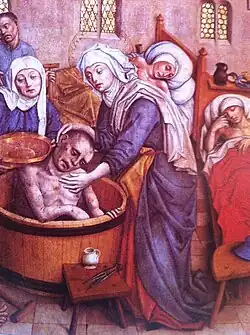 Another story told of Elizabeth, also found in Dietrich of Apolda's Vita, relates how she laid the leper Helias of Eisenach in the bed she shared with her husband. Her mother-in-law, who was horrified, told this immediately to Louis on his return. When Louis removed the bedclothes in great indignation, at that instant "Almighty God opened the eyes of his soul, and instead of a leper he saw the figure of Christ crucified stretched upon the bed."[20] This story also appears in Franz Liszt's oratorio about Elizabeth.[22]