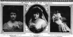 Mrs. Best was a protegee of Mrs. Astor and Mrs. Stuyvesant Fish.[30][31] Gladys Vanderbilt of the Breakers, and Countess Beroldingen, came at her debutante party in New York, and was personally invited to Mrs. Astor gala at the Beechwood Estate.[20][23][31] Mrs. Best was also announced to society by Mrs. Astor's son, John Jacob Astor IV, who later perished on the Titanic, and was a member of The Four Hundred during the Gilded Age, along with her cousin Charlotte Tooker Warren.[23] In 1907, the couple occupied, with Mrs. Clermont Livingston Best and Mrs. Eva Lincoln, the opera box at the Hudson Theatre, to see Brewster's Millions on Broadway.[32]