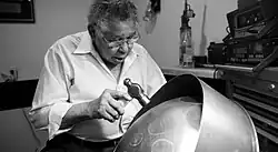 ![]() Mannette creating a steel pan in 2016 | |