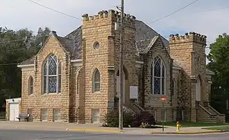 It is a one-and-a-half-story Gothic Revival-style structural limestone course with a woodframe hipped roof.