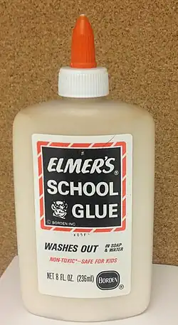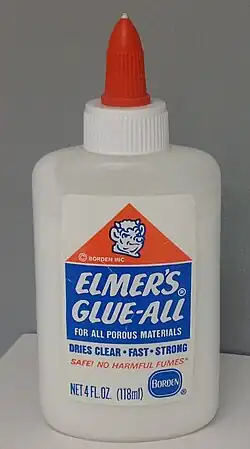 Immediately after World War II, the company expanded into synthetic resin glues and, in 1947, the first multipurpose consumer white glue, known as Elmer's Glue-All, was introduced.[7] The glue was packaged in a glass bottle with a Popsicle stick type wooden applicator attached with a rubber band. Consumer feedback confirmed a need for an easier to use delivery method, which prompted the company to develop easy to squeeze bottles featuring a twistable orange cap, introduced in 1962. This innovation remains in use and is a trademark of Elmer's Products.[8]