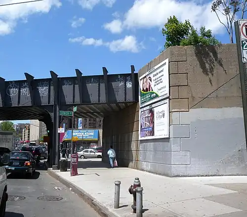 Site of the former Elmhurst station on Broadway across from Cornish Avenue. Outlines in the concrete mark the location of a former entrance stair, and some platform support members remain. | |||||||||||||||||||||