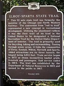 - ^ "Elroy-Sparta State Trail | Wisconsin Trails | TrailLink.com", Rights-to-Trails Conservancy, 2014.