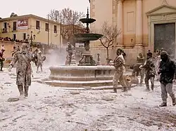 The annual festival of Els Enfarinats (Valencian pronunciation: [elz aɱfaɾiˈnats]) takes place in the town of Ibi in Alicante, Spain on December 28,[1] as part of celebrations related to the Day of the Innocents. Els enfarinats comes from the Valencian word for "breading", and roughly translates to "the breaded ones" or "the floured ones". In the day-long festival, participants known as the Els Enfarinats dress in mock military dress and stage a mock coup d'état. Meanwhile, the Casats i Fadrins, accompanied by a band of street musicians called the Rondalla, known by the name of Sonet, Xirimita and Tabal, tour the city. At 8 am, the Els Enfarinats take the city under the slogan "New Justice", and at 9 am the Race for Mayor will take place in which it will be decided who is to be Mayor of the Els Enfarinats. Then, the act of L'Aixavegó is carried out in the Plaça de l'Església (Church Square), where the Els Enfarinats reside. Here, it is decided that those who do not pay the fine will go to jail. At midday, a collection called the Arreplegada dels Enfarinats takes place through the streets of the old quarter and of the city centre of Ibi, terminating in the Sant Joaquim Sanctuary. They exercise their authority under a blaze of fireworks, flour bombs and eggs. At five o'clock in the afternoon the authority of Els Enfarinats comes to an end giving way to the celebration of the traditional Dansà.