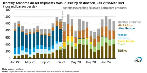 - ^ a b c d e f g h i "The number of violations of the EU-G7 embargo on seaborne imports of Russian petroleum products from the Black Sea in April-May 2023 increased significantly". 26 June 2023.