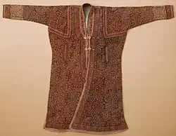 The stitches include sozni (satin), zalakdozi (chain) and vata chikan (button hole).[23] Other styles include dorukha in which the motif appears on both sides of the shawl with each side having a different color; papier-mâché; aari (hook) embroidery; shaaldaar; chinar-kaam; samovar (the antique Kashimiri tea-pot) is a very typical and popular design used in Kashmiri embroidery. The samovar pattern is then filled up with intricate flowers and leaves and twigs; Kashir-jaal which implies fine network of embroidery, particularly on the neckline and sleeves of a dress material.