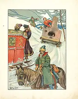 ![]() Emelian rides on the horseless sled. Illustration by Valery Kurdyumov, 1913. | |
