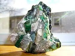 Emerald is a gemstone and a variety of the mineral beryl (Be3Al2(SiO3)6) colored green by trace amounts of chromium or sometimes vanadium.[2] Beryl has a hardness of 7.5–8 on the Mohs scale.[2] Most emeralds have many inclusions,[3] so their toughness (resistance to breakage) is classified as generally poor. Emerald is a cyclosilicate. It occurs mainly in association with quartz, muscovite, albite, schorl, microcline, fluorite, smoky quartz and elbaite.[1]