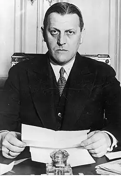 Chancellor Dollfuß made him his deputy on 21 September 1933. Fey continued the search for weapons belonging to the Republikanischer Schutzbund, which had been banned in March 1933.[2] The resistance of the Schutzbund to a government search for weapons at the headquarters of its Linz branch on 12 February 1934 sparked the Austrian Civil War.[3] Dollfuß mistrusted Fey's capabilities and on 1 May he lost his office of vice-chancellor to his bitter rival Starhemberg. During the July Putsch and Dollfuß' assassination he stayed in the background, later accusations of collaboration with the Nazis have never been conclusively established. He once again joined the Schuschnigg cabinet as Minister for Interior until his final disempowerment in 1935, shunt off to the Donaudampfschiffahrtsgesellschaft.
