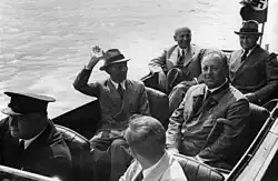 After the Nazi seizure of power in 1933, Jannings stayed on, prolonging his career by making State Films. He starred in several films promoting Nazism, in particular the Führerprinzip by presenting unyielding historical characters, in Der alte und der junge König (The Old and the Young King, 1934), Der Herrscher (The Ruler, 1937) directed by Veit Harlan, Robert Koch (1939), Ohm Krüger (Uncle Kruger, 1941), and Die Entlassung (The Dismissal, 1942).[9] He also took part in The Broken Jug directed by Gustav Ucicky. For his work in Nazi Cinema, Minister of Propaganda Joseph Goebbels named Jannings an "Artist of the State" (Staatsschauspieler)[10]