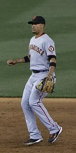Burriss refractured the foot in Spring training 2010.[18] He returned (in Fresno) late in the 2010 season, and was awarded with a call up to the Giants once the Grizzlies' season ended,[19] however he was not placed on the Giants' postseason roster. He appeared in 59 games for the Giants in 2011, splitting time between the Major League club and Fresno. In 2012, Burriss made the Giants out of Spring Training, but on July 28, 2012, he was designated for assignment.[20] Then on September 4, 2012, Burriss was added back to the Giants' roster [21] and finished the year in the Major Leagues only to be sent outright to the Fresno Grizzlies after the end of the season.[22] By outrighting him to the minors, the Giants prevented him from being eligible for arbitration after the season.[23] On November 8, 2012, Burriss elected free agency.[24]
