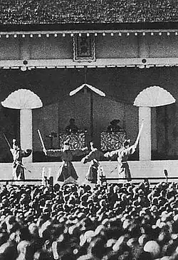 Veneration of Jimmu was a central component of the imperial cult that formed following the Meiji Restoration.[22] In 1873, a holiday called Kigensetsu was established on February 11.[23] The holiday commemorated the anniversary of Jimmu's ascension to the throne 2,532 years earlier.[24] After World War II, the holiday was criticized as too closely associated with the "emperor system."[23] It was suspended from 1948 to 1966, but later reinstated as National Foundation Day.[23][25]