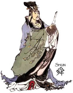 Emperor Shun (Chinese: 帝舜; pinyin: Dì Shùn) was a legendary leader of ancient China, regarded by some sources as one of the Three Sovereigns and Five Emperors[1] being the last of the Five Emperors. Tradition holds that he lived sometime between 2294 BC and 2184 BC. Tradition also holds that those with the surname Hu (胡) are descendants of Emperor Shun. The Duke Hu of Chen, 胡公滿, a descendant of Shun, became the founder of the State of Chen. Later Chen dynasty emperors such as Chen Baxian would also claim descent from Shun.[2][3]