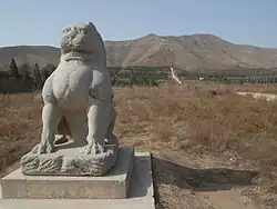 In 690, Empress Dowager Wu had her son Emperor Ruizong yield the throne to her, and she took the throne as empress regnant of a new Zhou dynasty, interrupting Tang. She imposed upon Ruizong and his family the surname Wu () to match hers.[10] In 692, Li Longji and his brothers were allowed to have residences outside the palace and were given staffs at their mansions.[12] In 693, both his mother Consort Dou and Li Dan's wife Crown Princess Liu (Li Dan's having been reduced to crown prince rank at that point) were killed by Wu Zetian inside the palace after Wu Zetian's lady-in-waiting Wei Tuan'er (韋團兒) falsely accused them of using witchcraft against Wu Zetian – and not even their bodies were recovered.[14] Subsequently, all of Li Dan's sons were reduced in title, and Li Longji's title was reduced to Prince of Linzi. He and his brothers, along with their cousins Li Guangshun (李光順) the Prince of Yifeng, Li Shouli the Prince of Yong, and Li Shouyi (李守義) the Prince of Yong'an (the sons of their uncle Li Xián, formerly crown prince but who had been forced by Wu Zetian to commit suicide in 684), were kept inside the palace and not allowed to have contact with outsiders[15] until 699, when they were allowed to leave the palace and take up residences outside.[16]