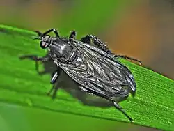 These flies have shining black body, head, antennae and legs. Halteres are black and metapleural bristles are partly whitish. The base of the abdomen has whitish hairs.[7] The legs are very hairy, with brush-like thighs especially in the females. The wings are long, robust, very dark brown or black. They have a long black sucking snout pointed downwards, used to suck their food.[8]