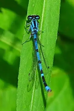 Many species in the genus Enallagma look similar to each other. The northern bluet looks similar to many bluet species.[3] They include the boreal bluet, familiar bluet, Hagen's bluet, marsh bluet, and vernal bluet. It can be distinguished from familiar bluet by the large postocular spots and the shorter cerci. The characteristics shared by northern and boreal bluets are their large eyespots, and a mushroom-shaped black spot on abdominal segment S2. Its best seen dorsally.