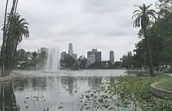 The video for "End Love" was co-directed by Damian Kulash, Jeff Lieberman, and Eric Gunther, and was filmed at Echo Park, around Echo Park Lake, in Los Angeles on March 28, 2010. The video shows the four members of OK Go, each dressed in solid neon-tracksuit of different colors, performing moves to the song. The band performed these moves using time-lapse photography to create certain special effects, such as appearing to move without walking, to move between two different points rapidly, or to play on the colors of their tracksuits in combination with these effects. In addition, some parts of the video have been significantly slowed down as the members of the band perform a move in unison.[2][3] The band performed their parts over an 18-hour period including overnight; in one segment, the band members use sleeping bags to sleep, with each member taking a turn "singing" parts of the lyrics over the night.[4] Near the end of the video, the band begins interacting with other people in the same manner. The video concludes with time-lapse photography of the fountain at Echo Park and the Los Angeles skyline that covers nearly eight additional days.[5]