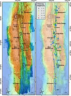 - ^ a b Clague, David A.; Martin, Julie F.; Paduan, Jennifer B.; Butterfield, David A.; Jamieson, John W.; Le Saout, Morgane; Caress, David W.; Thomas, Hans; Holden, James F.; Kelley, Deborah S. (June 2020). "Hydrothermal Chimney Distribution on the Endeavour Segment, Juan de Fuca Ridge". Geochemistry, Geophysics, Geosystems. 21 (6). Bibcode:2020GGG....2108917C. doi:10.1029/2020GC008917. ISSN 1525-2027. S2CID 218825220.