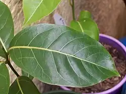Leaves are broad-elliptic to elliptic or ovate, veiny and usually 7–15 cm long, 3–6 cm wide, veins often yellowish. The horizontal form of the branches and attractive dark foliage makes this a particularly beautiful tree.