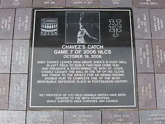 Chávez's signature moment came at Shea Stadium in Game 7 of the 2006 National League Championship Series. In the top of the sixth inning, with the game tied, 1–1, Cardinals third baseman Scott Rolen hit a pitch off Mets starter Óliver Pérez. Leaping over the 8-foot-high (2.4 m) left field wall, Chávez caught the ball with the tip of his glove to rob Rolen of a two-run home run. Chávez then threw to cutoff man second baseman José Valentín, who threw to Carlos Delgado at first base to double off Cardinals center fielder Jim Edmonds for an inning-ending double play. Although the Mets went on to lose the game and the series, "The Catch" was named the top post-season moment in the fifth annual This Year in Baseball Awards. On July 13, 2007, American International Group (the company whose left field advertisement was where Chávez made the catch) sponsored a special bobblehead doll day to commemorate the catch. The left field entrance gate of the Mets' current ballpark, Citi Field, features a metal silhouette of a baseball player making a leaping catch similar to the one Chávez made during the 2006 NLCS.
