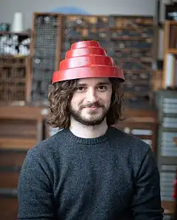 Though the traditional energy dome is red, several variants of the dome have existed. Devo wore green energy domes while performing "Whip It" on Solid Gold in 1981. The band sported white domes in a 1984 Diet Coke advertisement.[2] Silver chrome domes were worn by Devo in concert in 2002, made by covering a regular energy dome with metallic tape. In the music video for "Go Monkey Go", Mark Mothersbaugh can be seen wearing a white dome with a purple bottom tier.[3] An appearance by Devo on the VH1 show TrueSpin featured charcoal gray domes. Devo also wore safety orange domes at the 2018 Burger Boogaloo performance, to match new orange jumpsuits.[4] Assorted prototype and fan-made domes in a rainbow of colors also exist.[5]