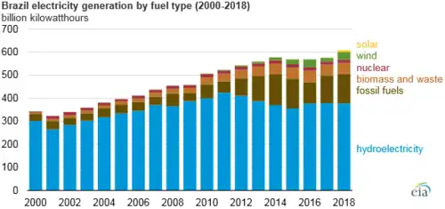 In total electricity generation, in 2019 Brazil reached 170,000 megawatts of installed capacity, more than 75% from renewable sources (the majority, hydroelectric plants).[29][30]