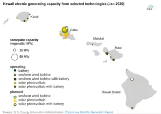 Ninety-nine percent of the population in Hawaii (outside of Kauai) is supplied by Hawaiian Electric Industries (HECO).[10] Kauai is supplied by consumer-owned Kauai Island Utility Cooperative. As of 2018, the total dispatchable capacity was 1,727 MW, and the intermittent generation capacity was 588 MW.[11] Each island generates its own power, unconnected to other islands.[12] The islands have several grid batteries.[13]