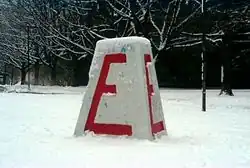 The Cairn is a large concrete object that symbolizes the Engineering Undergraduate Society's contribution to student life on campus. Normally it is painted white with a red 'E' for engineering, however it is common for many other faculties on campus to re-paint it in their own colours or otherwise deface it. Though the repainting is often done by faculty students, it also gets attacked by other groups such as the Totem Park 2009 Turkey Cairn stunt[13] when the Cairn was remodelled for Thanksgiving Sunday by the fifth floor of Haida. In 1980, a wooden replica was constructed and placed atop the Bloedel Conservatory in Vancouver's Queen Elizabeth park.