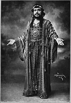 Caruso's voice extended up to high D-flat in its prime and grew in power and weight as he grew older. At times, his voice took on a dark, almost baritonal colouration.[50] He sang a broad spectrum of roles, ranging from lyric, to spinto, to dramatic parts, in the Italian and French repertoires. In the German repertoire, Caruso sang only two roles, Assad in Karl Goldmark's The Queen of Sheba and Richard Wagner's Lohengrin, both of which he performed in Italian in Buenos Aires in 1899 and 1901, respectively.[51]
