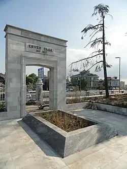 Enver's body was buried near Ab-i-Derya in Tajikistan.[88] In 1996, his remains were brought to Turkey and reburied at Abide-i Hürriyet (Monument of Liberty) cemetery in Şişli, Istanbul. He was re-buried on the 4 August, the anniversary of his death in 1922.[89][90] Enver Pasha's image remains controversial in Turkey, since Enver and Atatürk had a personal rivalry at the end of the Ottoman Empire and his memory was cultivated by the Kemalists.[90] But upon his body's arrival in Turkey, he was rehabilitated by the Turkish President Süleyman Demirel who held a speech acknowledging his contributions to Turkish nationalism.[90] Following renewed hostilities between Armenia and Azerbaijan over the Nagorno Karabakh region in 2020, Enver Pasha's role during World War I was praised by Turkish President Erdoğan during an Azeri victory parade in Baku.[91] In 2023, Azerbaijani officials issued a map of the formerly Armenian Stepanakert, renaming one of the streets after Enver Pasha.[92]